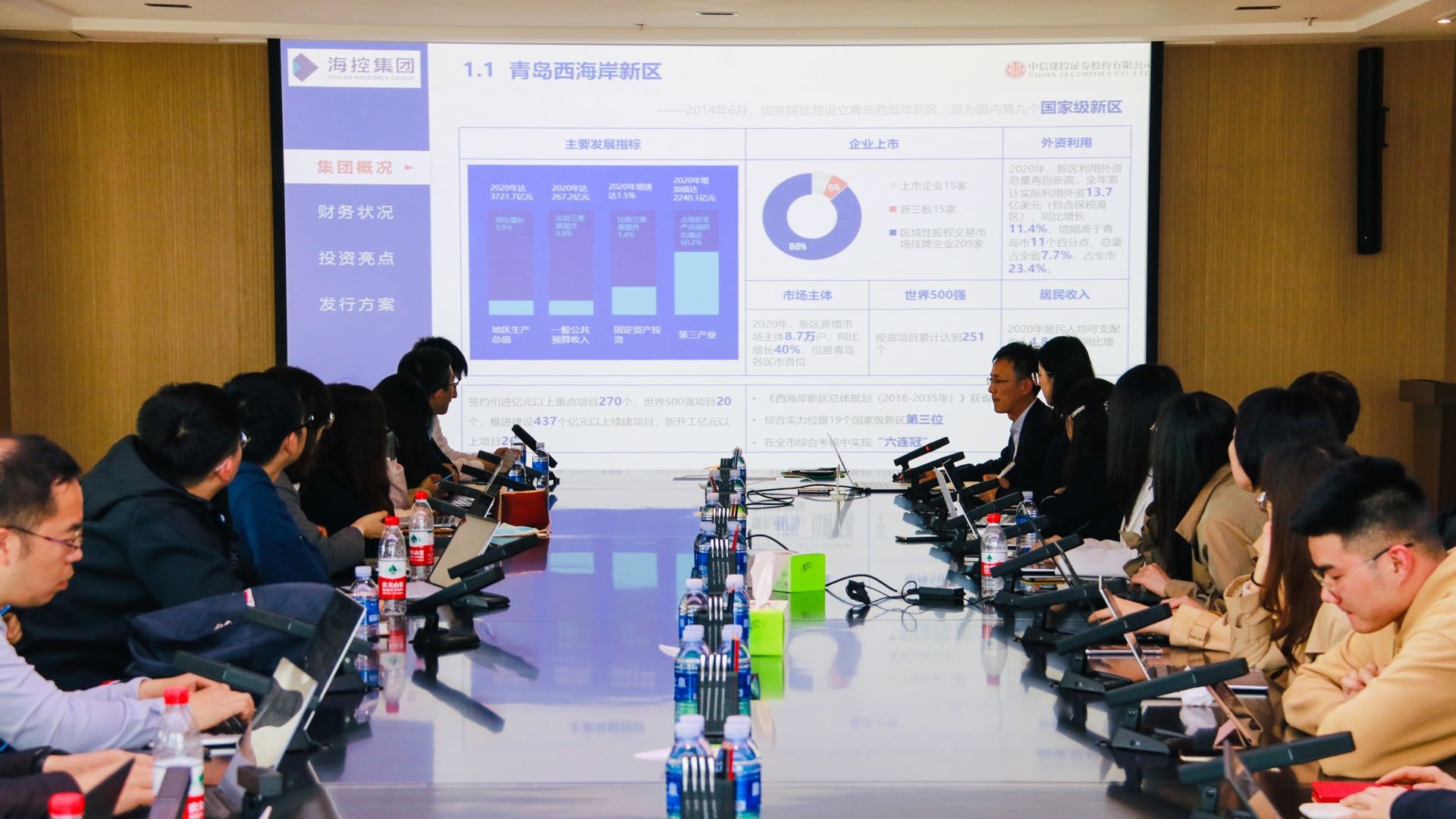 ??丶瘓F融資負責人對青島西海岸新區和??丶瘓F發展情況進行了全面介紹。??丶瘓F作為新區國有資本控股集團,截至2020年12月,注冊資本50億元,控股一級公司16家,其中上市公司1家,持股公司9家,直屬子公司6家,資產總額約1100億元,獲AAA主體信用評級。