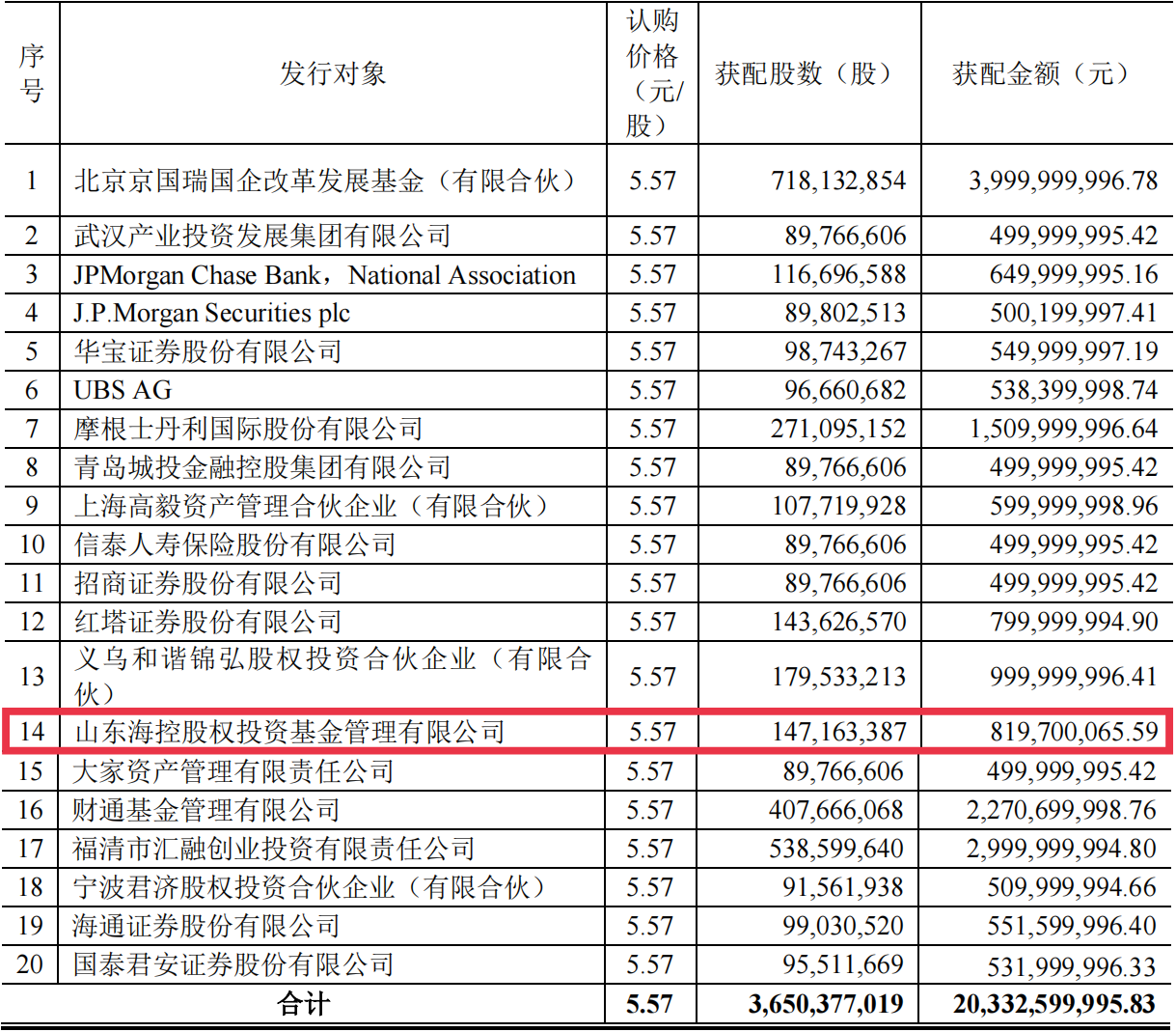 8月18日,京東方A(00725)披露非公開發(fā)行A股股票發(fā)行情況報(bào)告書,共發(fā)行股票36.5億股,募集資金203.33億元,海控集團(tuán)旗下基金公司—山東海控股權(quán)投資基金管理有限公司(以下簡稱“海控資本”)認(rèn)購約8.2億元,成功完成資本市場(chǎng)首秀。