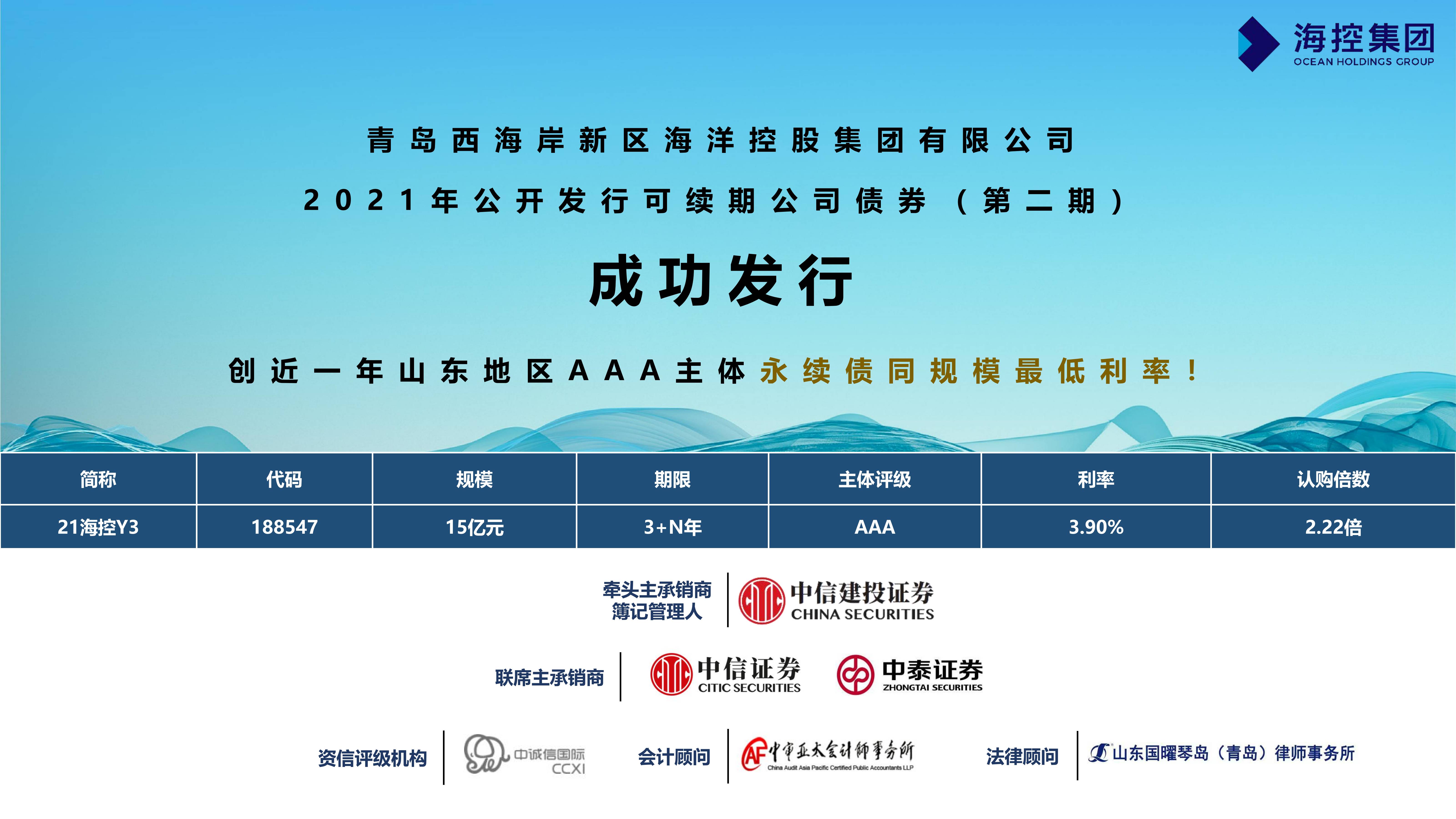 8月30日,海控集團(tuán)“2021年公開發(fā)行可續(xù)期公司債券(第二期)”成功發(fā)行,期限3+N年,發(fā)行金額15億元,發(fā)行票面年化利率3.90%,創(chuàng)近一年山東地區(qū)AAA主體同規(guī)模最低利率。