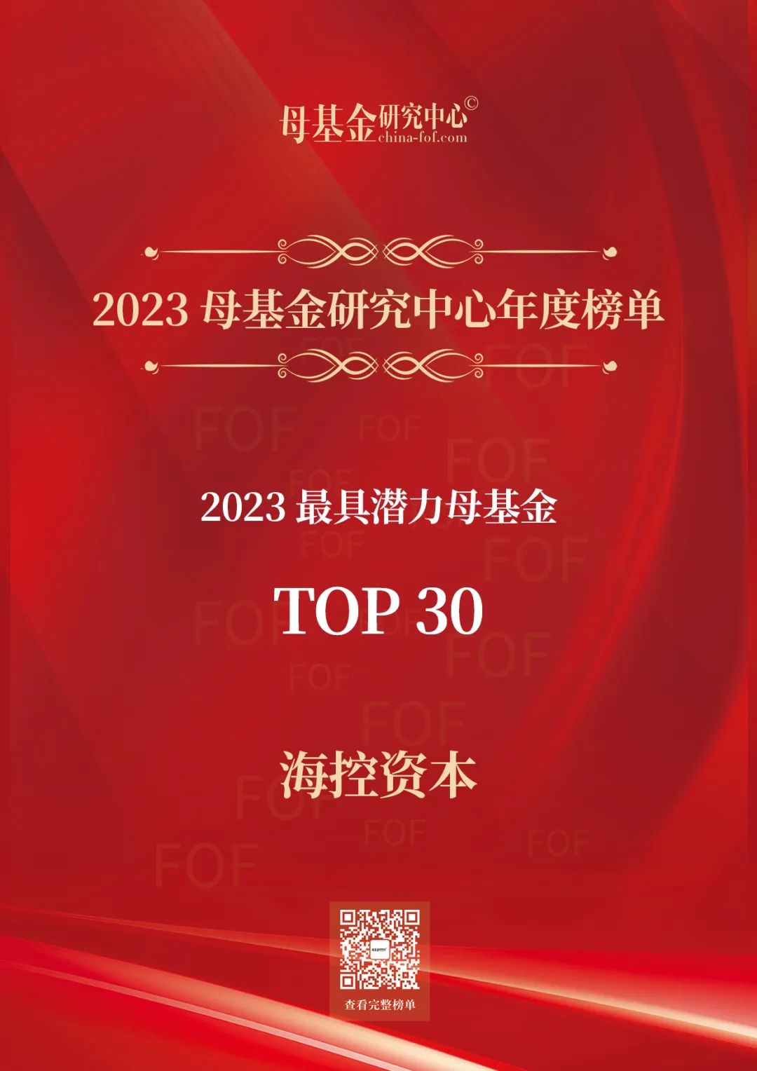 2023年12月11日,2023母基金研究中心年度榜單隆重揭曉,海控資本獲評(píng)「2023年最具潛力母基金TOP30」。