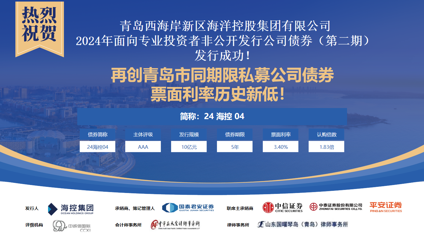 私募公司債票面利率屢創新低,不僅持續增強資本市場對西海岸新區及海控集團的信心,更不斷深化資本市場對海控集團綜合實力和發展前景的認可。未來,海控集團將持續優化資本配置,提升資本運營專業水平,以卓越的業績助力新區重大戰略項目推進實施,為區域經濟蓬勃發展貢獻力量。